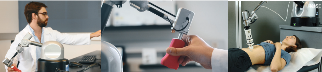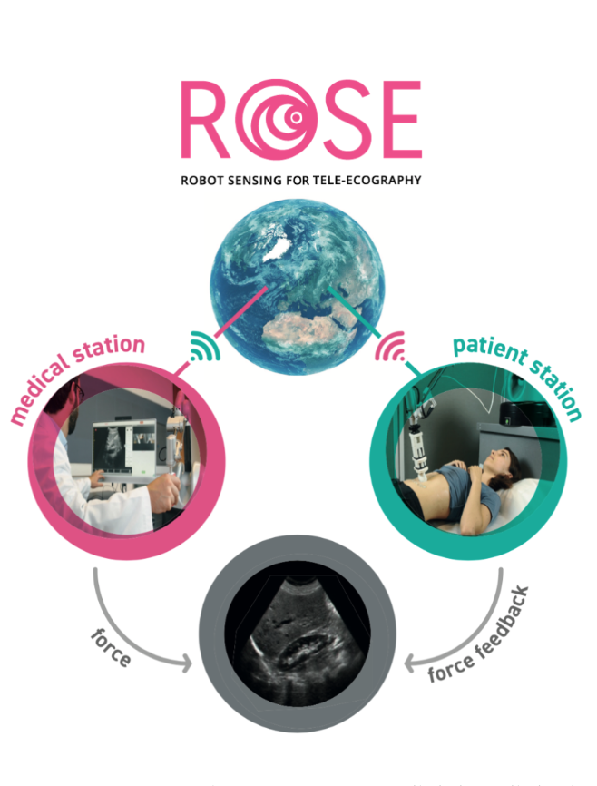 A new paradigm of diagnosis by tele-ultrasound will be established with ROSE, through which doctors and patients can interact without the need for physical proximity. Each ROSE system includes two robotic ergonomic stations (one on the medical side and one on the patient side).